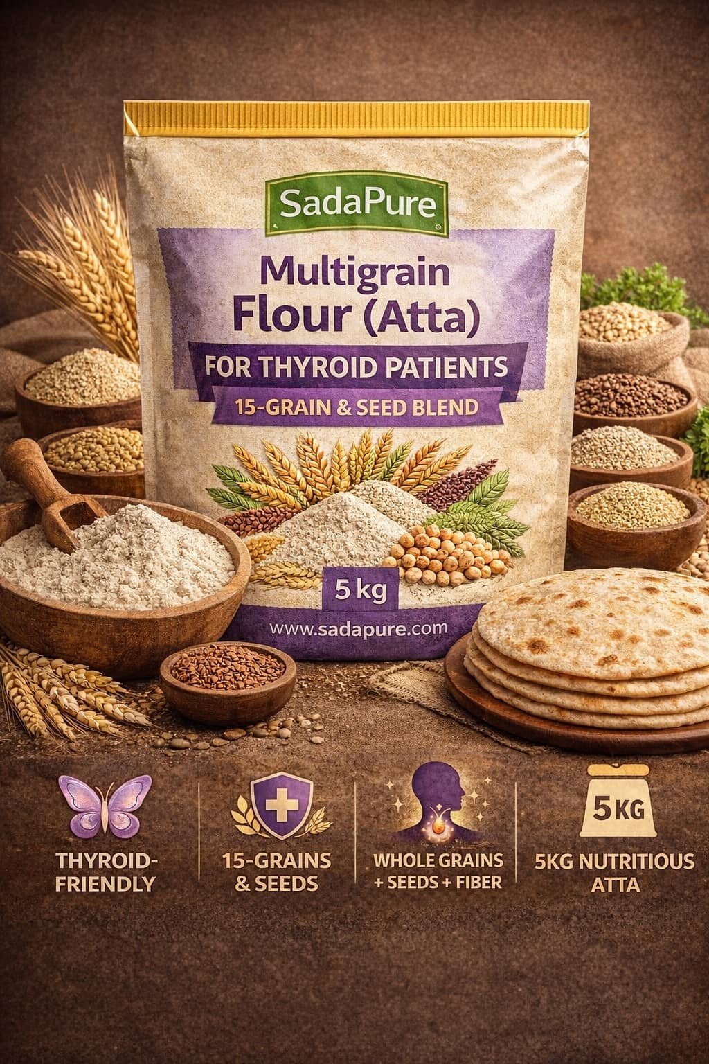 SadaPure Thyroid-Support Multigrain Atta (15-grain) is formulated for everyday use in both hypo and hyper routines.
