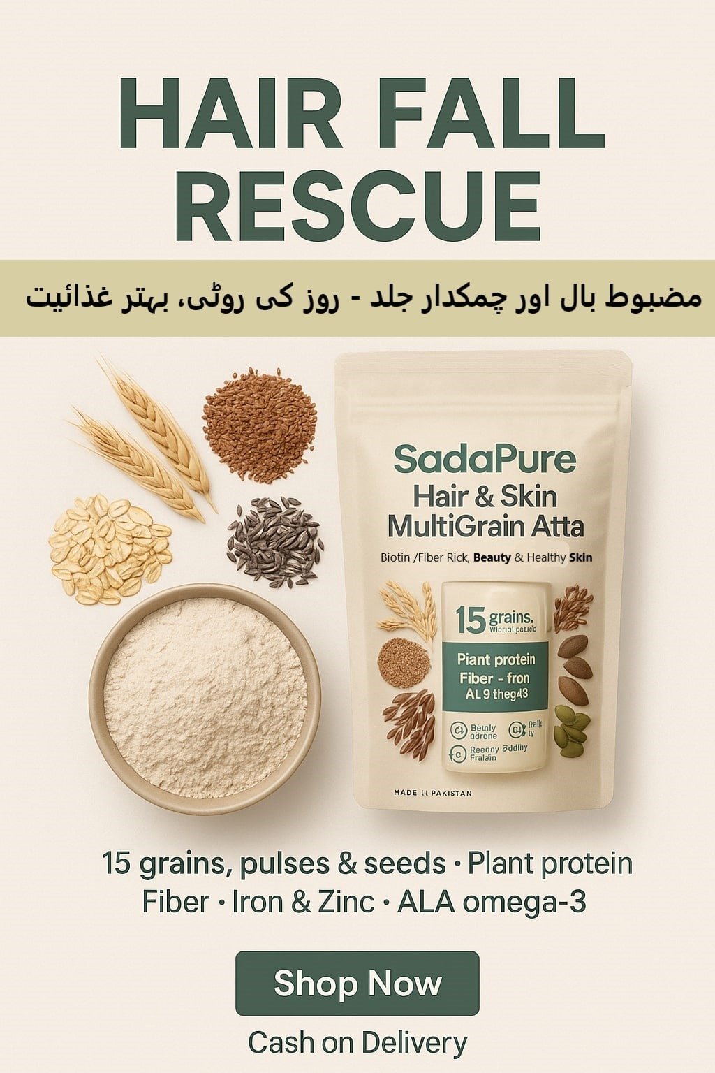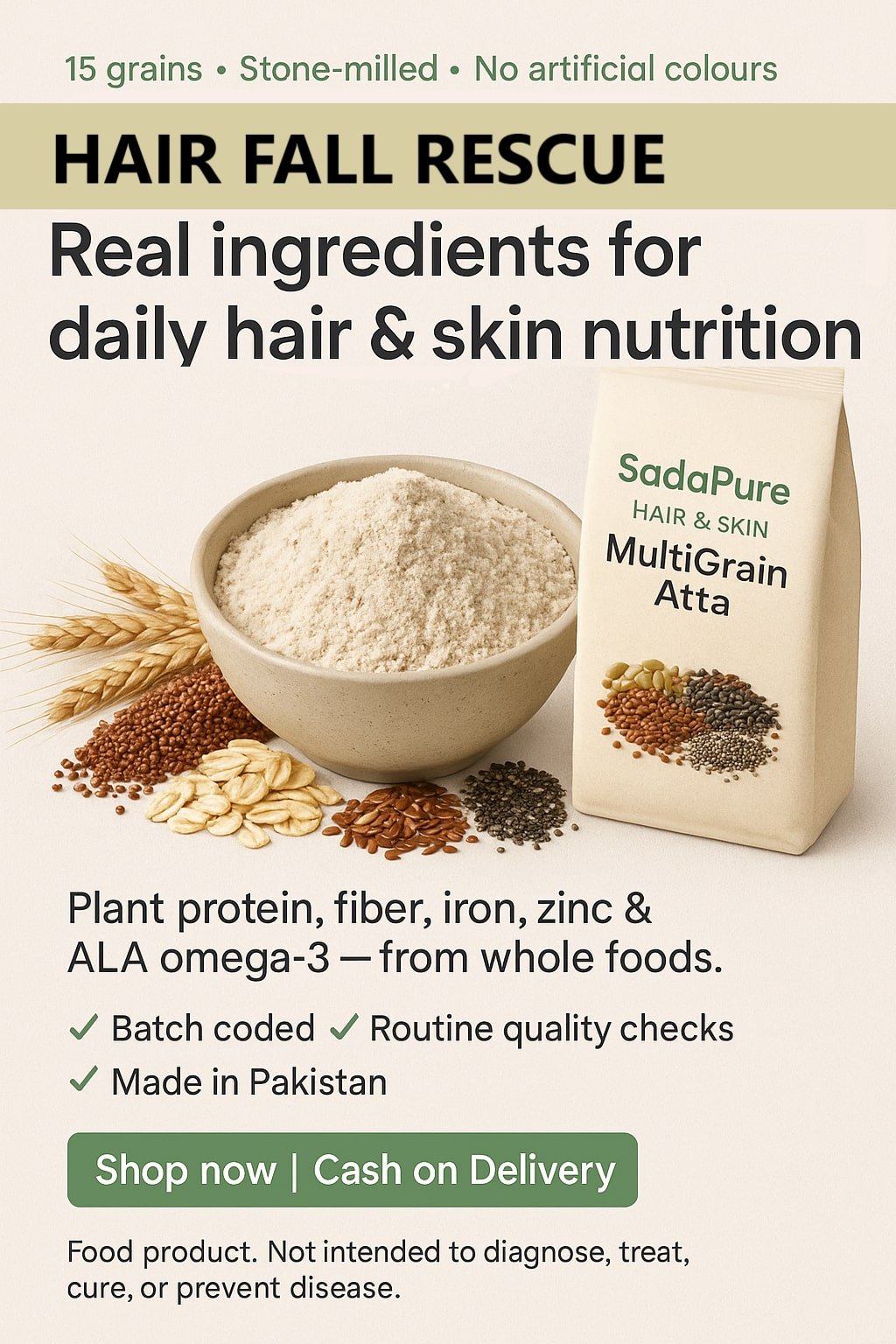 SadaPure Multigrain Hair-Support Atta is a daily chapati flour built from 15 whole-food ingredients. It supplies protein, fiber, iron, zinc, vitamin E, and ALA omega-3 when used as part of a balanced diet.
