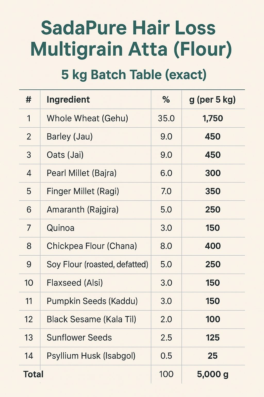 5 kg Batch Table (exact)